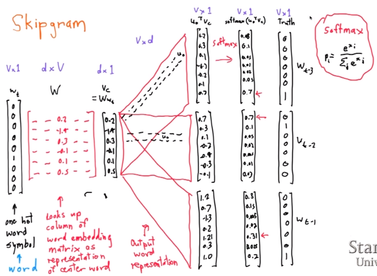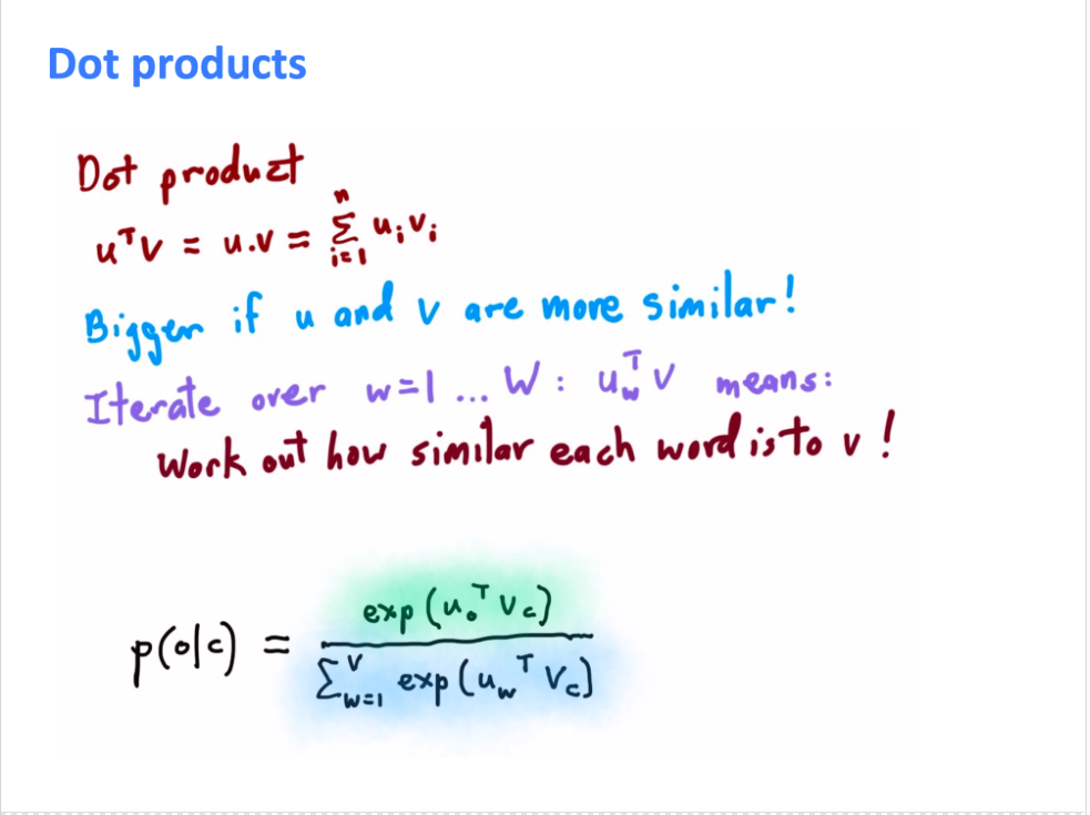 Vc (one-hot index 와 look up colu;n of word embedding 을 곱한 것) 을 Uo 와 곱하면 확률 모델에서 우리가 구하고자 하는 P(O|C) 의 분자 부분이 구해짐 (exponentiate 빼고). 그리고 여기에 softmax 를 넣게 되면 softmax (UoT x Vc ) 가 구해지게 되는 것!