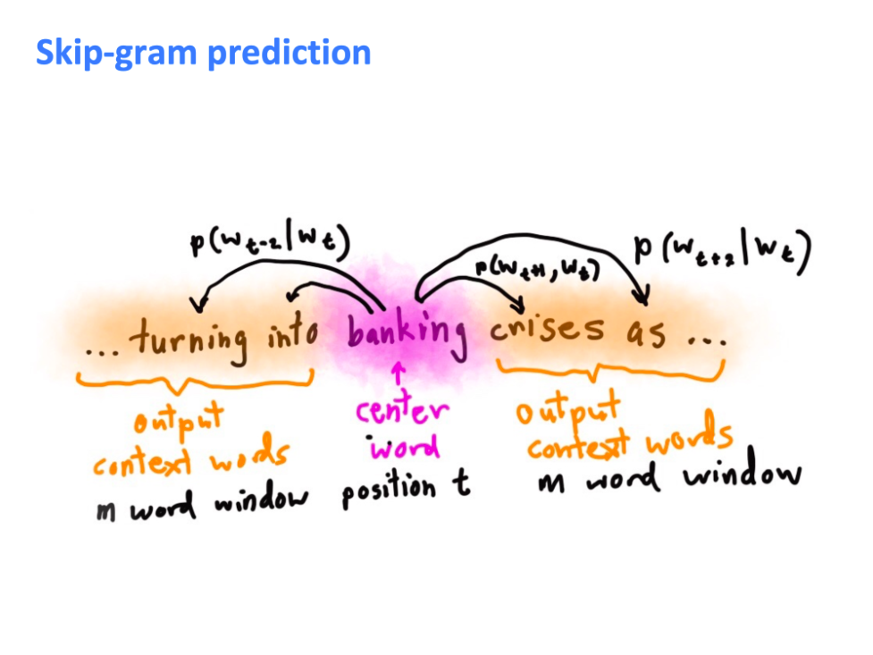 Skip-gram 모델의 핵심은 center word 를 가지고 context worrds 를 predict 하는 것! 이 때, 교수님이 이 모델에 대해 only one probability distribution 만 있고, 각 단어마다 이 단어기준 왼쪽 2번째 1번째가 아니라고 했는데 (?) 무슨 말인지 정확히 모르겠음. 하지만, 아마도 word order 가 중요한 LM 모델과 다르게, word order 가 무시되고 왼쪽에서 2번째, 왼쪽에서 1번째가 아니라 center word 와의 거리와 상관없이 단순히 P( Wo | Wc ) - Wo 는 context words vector, Wc 는 center word vector - 를 쓴다는 게 아닐까 싶다.