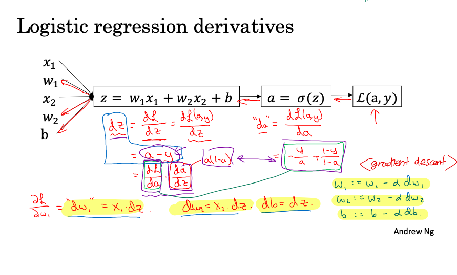 - $\mathrm{d} w_{1}$ 는 $\frac{\mathrm{d} J }{\mathrm{d} w_{1}}$ 을 나타낸다. 즉, 구하고자 하는 최종값에 대한 미분값이다. (코딩할 때를 위해서 이렇게 표기하고, 변수 이름도 저렇게 쓸거임)