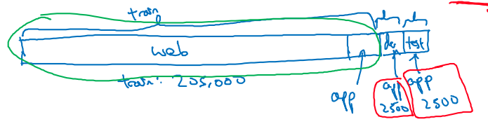 우선 dev / test set 의 나의 target 이기 때문에 app 에 사용될 real data 로만 이루어져야 한다. 다만, real data 가 10,000 개가 있다면 이 것의 절반은 반씩 나누어서 (2500, 2500) dev /test set 으로 쓰고 나머지 (5000개) 는 이미 온라인에서 구한 training data 와 섞는다.