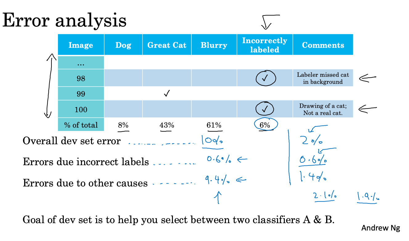 근데 오류를 분석하다 보니 Incorrect Labeled data 가 많다는 것을 알게 됐어. 이걸 고치는 게 중요할까? 이 때도 마찬가지로 오류 분석을 해보면 overall error rate 중에서 이 mislabeled 된 데이터가 어느 정도를 차지하는지 알 수 있어.