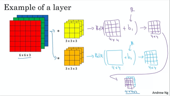 왼쪽부터 Input 을 받아, 1개의 Filter 를 거친 이후, 여기에 Real number 인 bias 를 더한후 활성함수를 씌워준다. 그러면 각 filter 마다 하나의 2D output 이 나오는데, 이걸 그대로 쌓아서 (stack) 에서 하나의 output 으로 만들어내는 것이 하나의 layer!