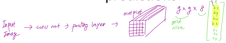 최종 output : 각각의 grid 마다, 8개의 y output ($P_c$, 좌표, class probability)