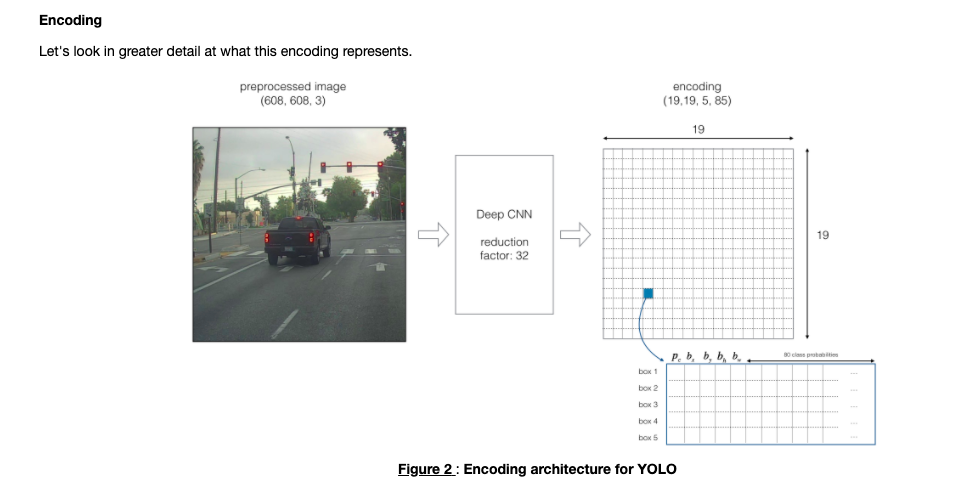 Input Image (608, 608, 3) 을 Deep CNN 을 통과시켜서 (19, 19, 5, 85) 으로 encoding 함. (5 - number of anchor boxees, 85 - $P_c$, 좌표, 그리고 80개의 class 에 대한 probability)