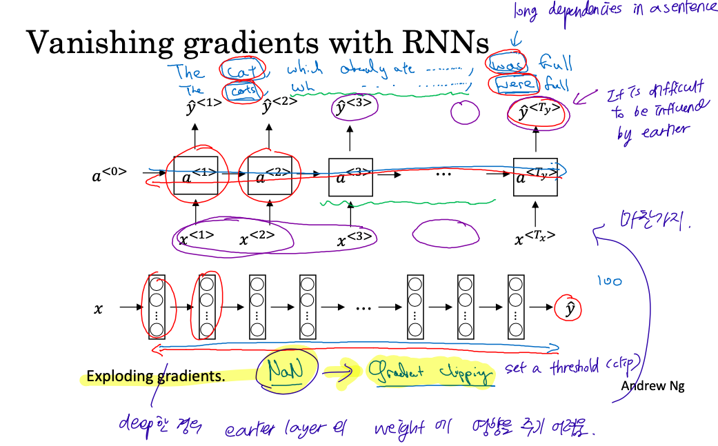 앞서서 RNN 의 back prop 의 핵심은 horizontal backprop 즉, back prop through time 에 있다고 얘기했다. 근데 이 time step 의 간격이 너무 크면 earlier step 의 weight update 에 영향을 주기가 어렵다. 이건 그냥 이전에 배운 generic DNN 에서 vanishing gradient 가 일어나는 거랑 같은 문제다 (그래서 그걸 보완하기 위해 residuals 를 사용했었지). 그리고 standard DNN 과 마찬가지로 exploding gradient 문제도 생길 수 있는데 해결방법은 같다. threshold 를 설정해서 gradient 가 그 이상이면 그냥 threshold 값을 사용하는 것. (exploding gradient 가 발생할 경우 output 값으로 NaN (Not-a-Number) 값이 출력된다고 한다)