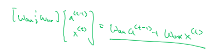 여기서 $W_{a}$ 는 $W_{aa}$ 와 $W_{ax}$ 를 horizontal 하게 concatenate 한 벡터이고, $[a^{<t-1>}, x^{<t>}]$ 는 $a^{<t-1>}$ 와 $x^{<t>}$ 를 vertical 하게 stack 한 것임.