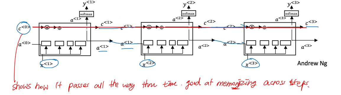 앞서서 GRU 보다 LSTM 이 더 강려크하다고 했는데, 아래 그림의 빨간 라인을 따라가면 이해하기 쉽다. earlier step 의 memory cell 이 곱하기와 더하기만 거쳐서 current memory cell 까지 그대로 pass 되는 것을 볼 수 있다.