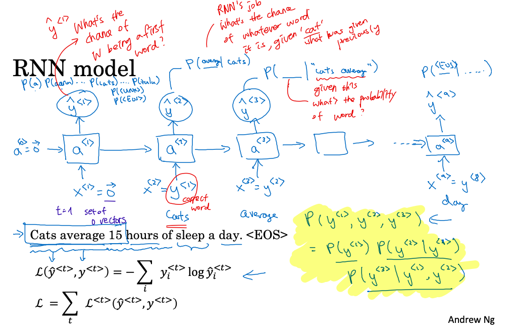 2번째 time step 의 x 는 $y^{<1>}$ 이다. 예를 들어 cats 가 $y^{<1>}$ 라고 할 때 y prediction 은 cats 이 주어졌을 때 어떤 단어가 올 확률을 계산한다. (궁금한 점. y prediction 은 그럼 vocab 내 모든 단어에 대해서 이 확률을 계산하는 건가? 그래야지 sigmoid 를 통해서 하나의 단어를 output 으로 할 수 있는거잖아.) 그리고 원래 문장은 $P(average | cats) = 1$ 이니까 여기에 대한 cross entropy loss 를 구하면 되겠지?