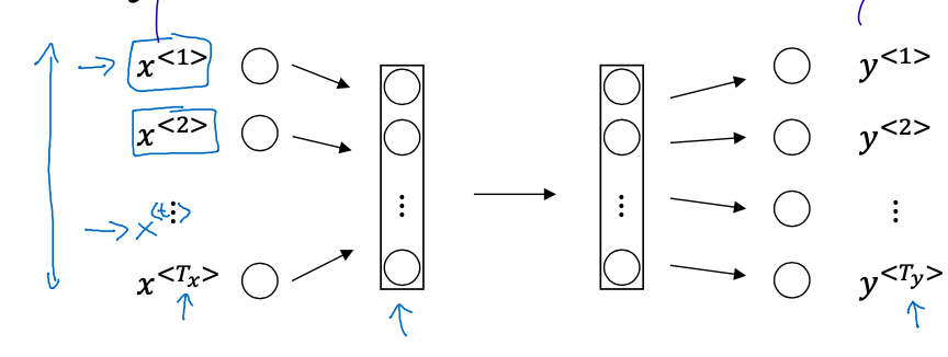 => 우선 input 을 모두 read 한 다음에, 그 다음에 차례로 prediction 생성 (인코더 - 디코더 !! 그동안 정확히 왜 어떤 NLP task 에서는 인코더 디코더가 쓰이고 안 쓰이는지 몰랐는데 그걸 이해시킨 갓 Andrew.. ) - 1) $T_{x} = T_{y}$ 즉, input length 와 output length 가 같은 경우 : NER