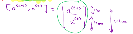앞서서 한 개의 RNN unit 을 식으로 나타내었다. $$a^{<t>} = g_{1}(W_{aa}*a^{<t-1>} + W_{ax}*x^{<t>} + b_{a})$$