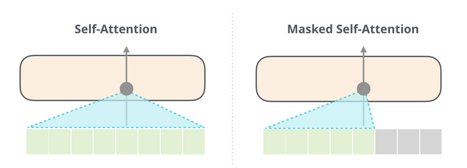 (BERT가 사용하는) self-attention과 (GPT-2가 사용하는) masked self-attention이 확연히 다르다는 것은 중요합니다. 일반 self-attention block은 자신보다 오른쪽에 있는 token을 계산 과정에서 볼 수 있도록 합니다. masked self-attention의 경우에는, 이런 상황을 막습니다.