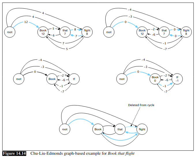 이렇게 모든 node 를 서로 연결해놓은 상태에서 각 edge 를 scoring 하는 게 graph-based 방식임. 그리고 이렇게 weighted edges 를 가지고 각 node 에 대해서 best parent edge 를 선택하고 그게 valid graph 면 parsing 완성. 그게 아니라 cycle 을 포함하고 있다면 (wight scaling + cycle colapse 을 통해서) cycle 을 없애고 다시 best tree 를 선택하는 게 전체 알고리즘이다.