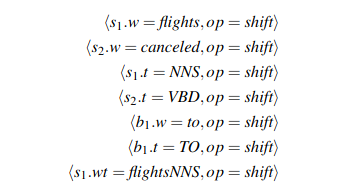 이 때 Predictor 는 input 으로 configurations 를 받게 되는데 configuration 이라는 건 local state + set of relations (previous predictions) 만 가지고 위의 4개의 operator 중에 하나를 선택하는 거임. (실제로는 라벨까지 있기 때문에 총 operator 수는 대략 number of labels x operator 임). 왜 local state 란 buffer 의 top word, 그리고 stack 의 top 2 words 를 말함. 즉 buffer 와 stack 의 top tokens 만 보고 판단하기 때문에 local stae 라고 하는 거임. (즉 buffer 랑 stack 의 top 에 위치하지 않은 token 들을 prediction 할 때 고려하지 않음)