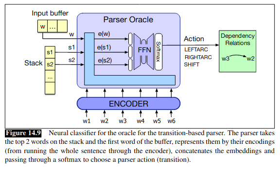 Predictor / * Oracle 는 결국 input 으로는 configurations 을 받고, output 으로는 해당 configurations 이 주어졌을 때 택해야 하는 operator 를 predict 해야 함. 그렇다면 each step 에 대해서 config - operator pair 가 training data 로 있어야 된다는 뜻인데 이건 어떻게 구하냐? 이건 사실 input - complete dependency parse 만 있으면 구할 수 있음.complete dependency parse라는건 결국 set of tuples: (child, head) 라고 할 수 있음 (edge label 까지 있으면 triplet 이겠지만 simplicity 를 위해서 없다고 가정) 이 set of tuples 과 input sentence 를 reference 로 갖고 있는 상태에서 내가 가지고 있는 parser 가 이 input sentence 를 parse 한다고 simulate 하는 거임. 우선 첫 step 로는 buffer -> stack 으로 shift action 으로 항상 시작하니까 그렇게 하고, stack 에 있는 2개의 단어가 (child, head) 페어에 해당한다면 right arc 나 left arc 를 해야한다는 걸 알 수 있으니까 right operator 를 선택할 수 있고 그럼 현재 step 에 대해서 configs 와 operator 가 준비된거임. 이걸 반복해서 end condition 에 다를때까지 하면 문장 하나에 대한 training data 를 갖게 되는거야