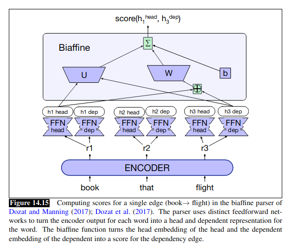 인코더를 통해서 each token 에 대한 embedding 을 얻고, 각 token 을 different feed forward networks 를 통과시켜서 1) token embedding as a head 2) token embedding as a dependent 를 얻는다. 예를 들어서 (w1 (head representation) , w2 (dependant representation)) 이 2개를 biaffine algorithm 에 넣어서 w1 이 w2 의 head 인 score 를 계산. 모든 edge 에 대해서 이걸 계산한 다음에 each node 의 incoming edges 에 대해서 softmax 계산 하면 해당 node 의 모든 candiate parent 에 대한 probabilty score 를 얻을 수 있음. 여기까지 하고 나면 나머지는 위랑 똑같음. each node 마다 모든 incoming edge 중 maximum socre 를 주는것만 선택한 다음에 cycle 있으면 cleanup. 결국 각 node token 을 어떻게 represent 하고 score 를 어떻게 assign 하냐에 따라 neural algorihm