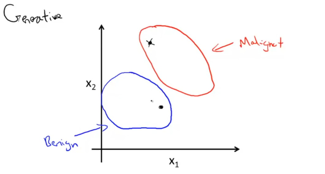 아래 그림처럼 빨간색 원이 malignant tumor 에 대해 모델이 배운 features 라고 하고, 파란색 원이 banign tumor 에 대한 features 라고 하자. 새로운 데이터가 주어졌을 때 (원 안의 점), 이 데이터가 내가 모델링한 빨간원의 데이터와 비슷하면 malignant 파란원이랑 비슷하면 banign. 어쨌든 각 클래스에 대해서 x features 를 배우는 모델인 거임.