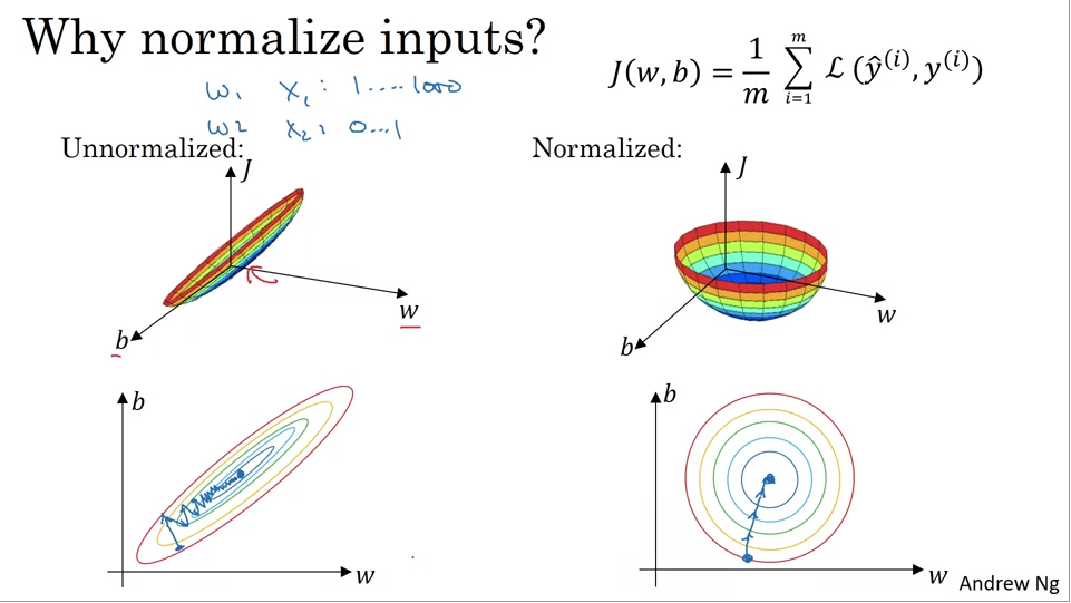 x1= 1 에서 1000 까지의 value 를 가지고 x2 = 0..1 까지의 value 를 가진다고 할 때, 그럼 마찬가지로 각각 input feature에 상응하는 weight 도 다른 scale 을 갖게 됨. 결과적으로 cost function 이 왼쪽으로 한쪽은 굉장히 좁고 (elongated) , 한쪽은 넓은 모양이 되는데 이 경우에는 learning_ratio 를 아주 작게 해서 아주 많은 steps 을 밟아야지만 최적에 이르게 된다 (위에서 왼쪽 하단 이미지 참고) . 그렇게 때문에 input normalization 해서 두 input feature 의 scale 을 조정해주면 오른쪽 하단처럼 되고 결국 input normalization => fast learning 을 위해 필요한 게 되겠음.